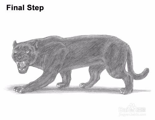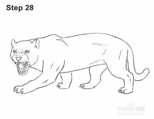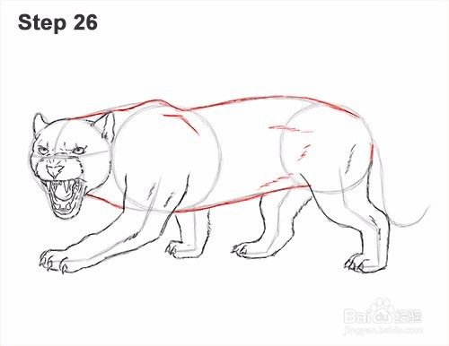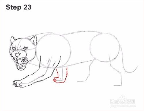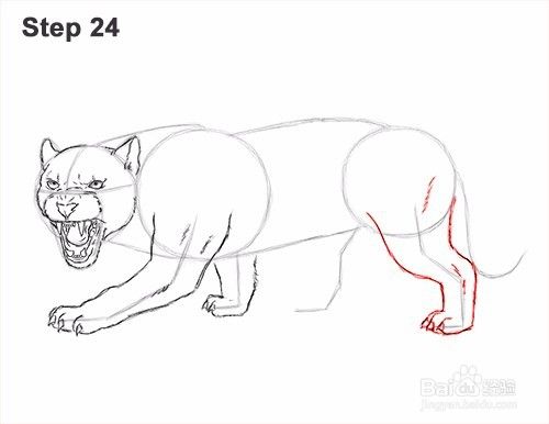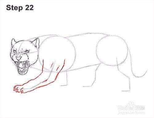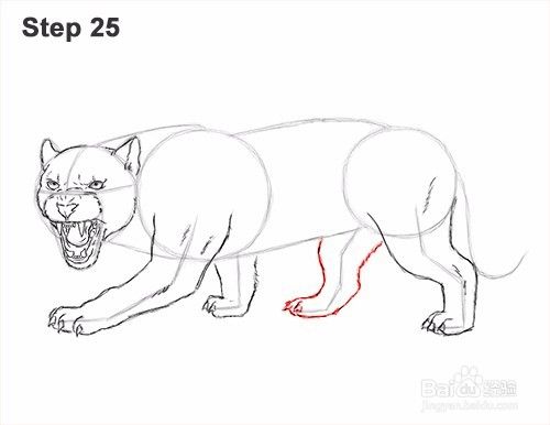 第25步:使用黑豹身体下的最后一条斜线作为引导,画出另一条后腿。按照指南的路径绘制腿周围的形状。顶部应该比底部厚。在脚尖增加爪子。从这个角度只能看到几个爪子。