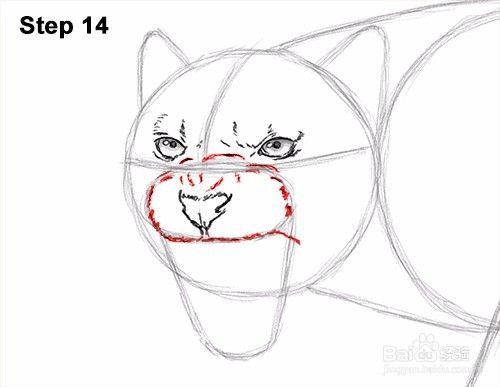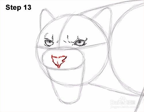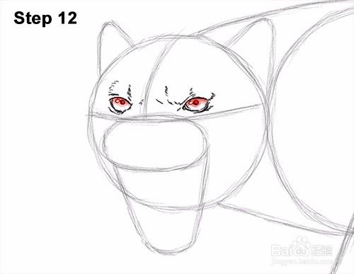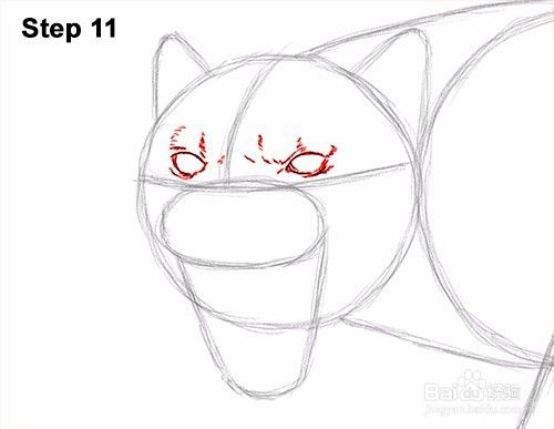 第11步:轻轻地将头部内的眼睛画成两个小椭圆。使用建设线作为黑豹放置眼睛的指南。当你正确地得到椭圆的位置和尺寸时,将线条变暗。使每只眼睛的侧面尖锐地代表眼睛的角落。使眼睛的边缘变暗并使线条变粗。在眼睛周围添加几笔以强调皱纹的眉毛。不要太担心这些线条,因为它们会在阴影步骤中丢失。