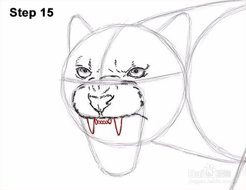 第15步:在第一个犬齿的左侧,在枪口下方画一条长的V形线。在右侧添加其他犬齿。不要把它拉得太近。在黑豹的犬牙之间,画出一系列方形的门齿。