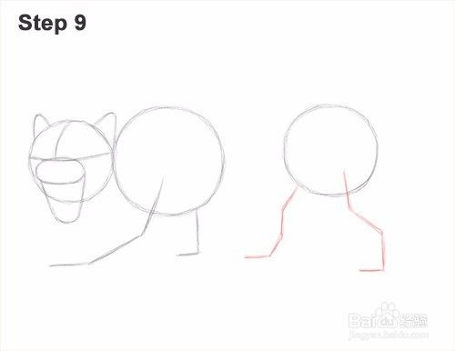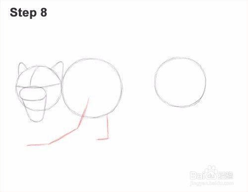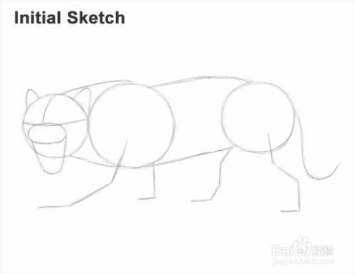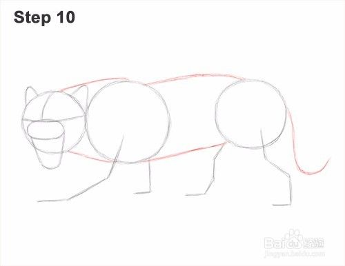 第10步:画出两条连接头部和身体的短线以创建颈部。画两条较长的线连接中间的圆圈,以完成躯干的导向。在右侧绘制一条长而弯曲的线条,形状类似于向后的字母J,作为黑豹尾巴的指南。