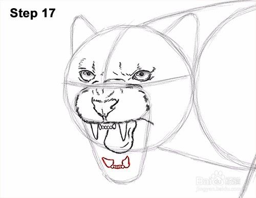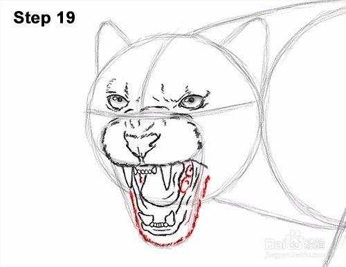 第19步:按照初始U形导线的路径绘制黑豹的下颚。沿着底部使用快速的短冲程来表现毛茸茸的下巴。在臼齿的可见部分,向内部添加几条曲线。
