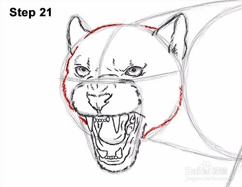 第21步:使用主要的圆圈作为引导,以画出头部的其余部分。按照圆圈的基本路径,但将头部的左侧绘制得更靠近眼睛。使头部的顶部有点平坦。在下部右侧为豹的强壮下巴添加一条长弧线。