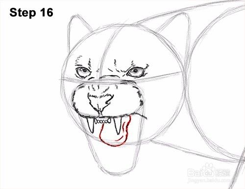 第十六步:在牙齿下面,画一条长长的豹纹舌线。舌头的形状应该类似于波浪形的字母U.