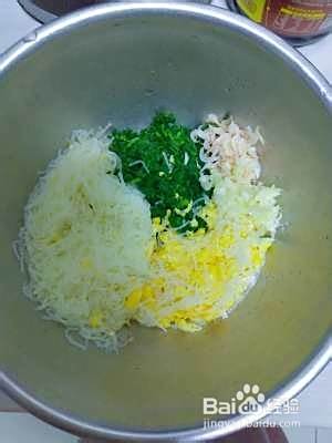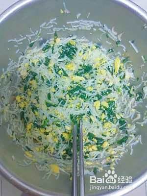 第二天早上,拿出面团回温,备馅儿料,将菠菜焯水后沥干水分切丁,虾皮提前泡一下,鸡蛋炒成滑蛋样子、葱切丁
