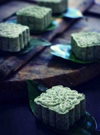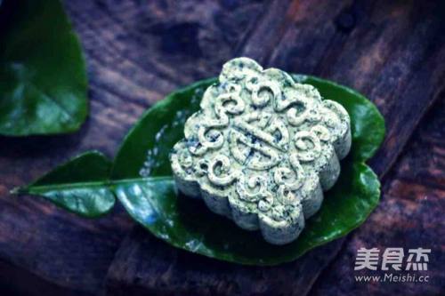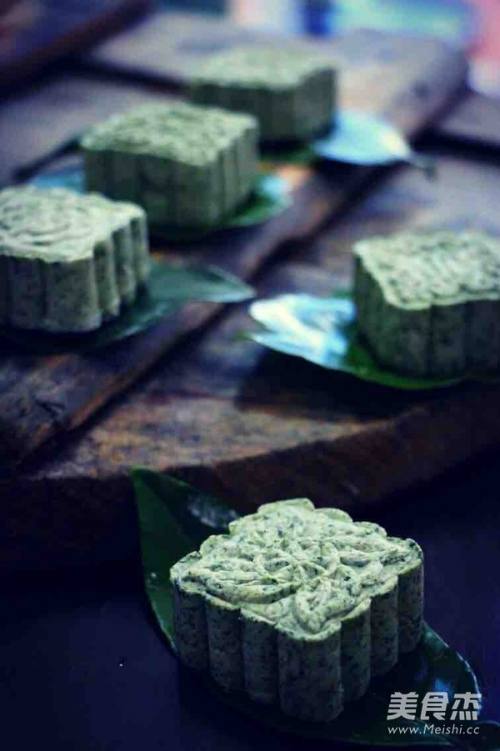 6把艾叶面团分成40克左右大小的小面团,搓圆压扁,包入馅料再搓成丸子状,放入模具中压处即可。