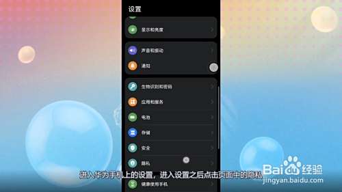 进入华为手机上的设置,进入设置之后点击页面中的隐私。