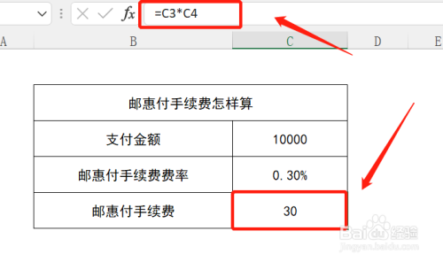 最后,根据邮惠付手续费等于支付金额乘以邮惠付手续费费率,在表格中输入公式【=C3*C4】即可算出邮惠付手续费了。如下图所示: