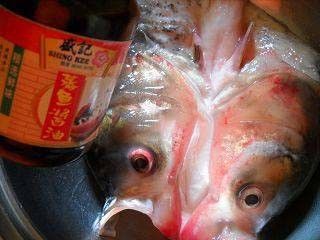 9.锅中油烧热,下鱼头两面煎黄;盛起备用