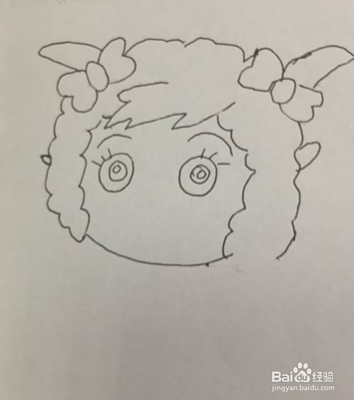 首先先画出美羊羊毛茸茸的的脑袋,然后在脑袋两边画出她的小耳朵以及在脑袋上画出两只羊角,羊角上还分别系有蝴蝶结