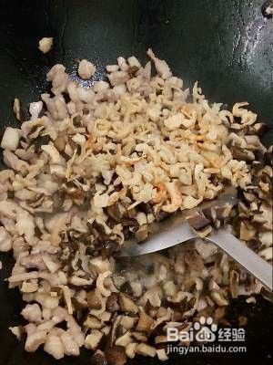 加鱼露炒香五花肉后,把切好的香菇,虾米放入炒香。炒干之后放点盐和酱油。咸度随个人喜好。