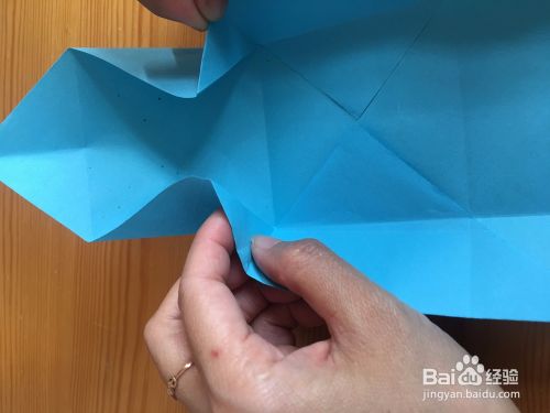 现在是关键的一步,如下图红线折痕,两侧都向内推.然后沿红色横线位置向内折.