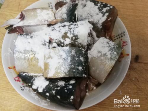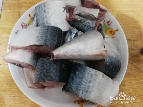 鲅鱼去掉鱼头,内脏清洗干净切段放入盘中,倒入酱油,料酒,醋腌制10分钟。