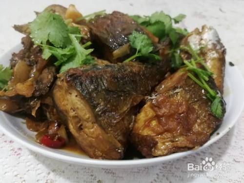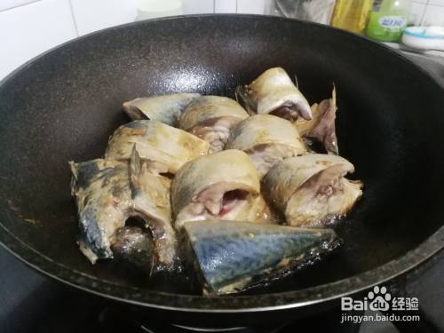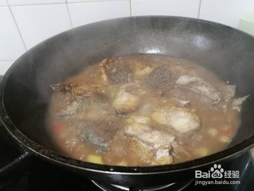 放入葱,姜,蒜,白糖,大料,鸡精,加水和鱼段齐平,大火烧开,中火炖。