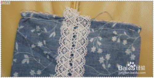 翻回正面再在短边车上花边装饰。这里需将花边一侧内折缝合以形成一个圈。