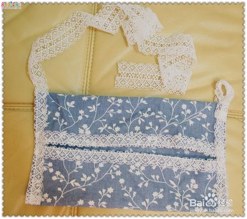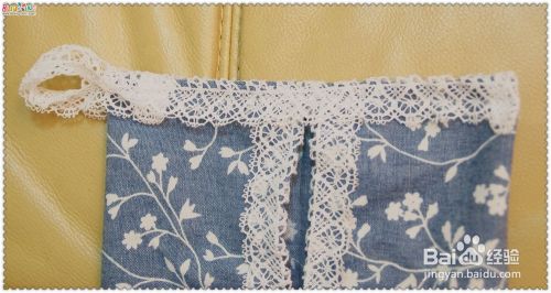 适当的位置缝上松紧带、扣子。位置以纸巾放入不掉出为宜,如果没有扣子、松紧带也可两侧分别缝少许花边直接打成蝴蝶结。将长的花边穿过另一侧的圈就OK啦。