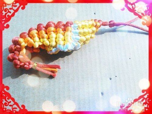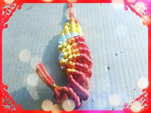我们把虾子最上面的四根线绑到一起,把多余的线用剪刀剪掉,再用打火机烧线头。尾部我们留几根线,用剪刀剪整齐,用金线系上三圈。一只可爱的虾米就做好了,送给亲戚朋友吧。
