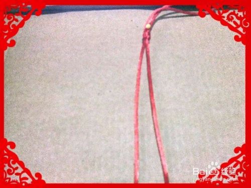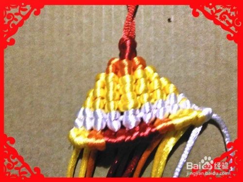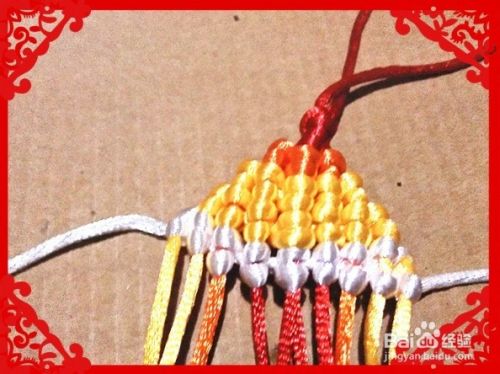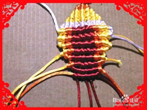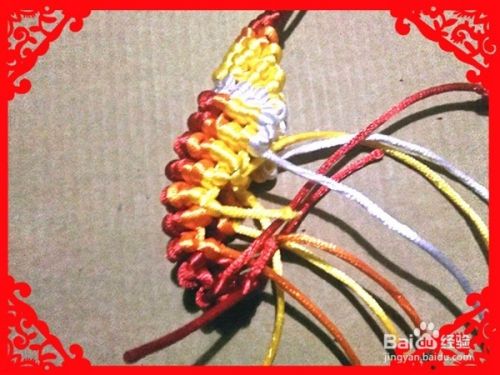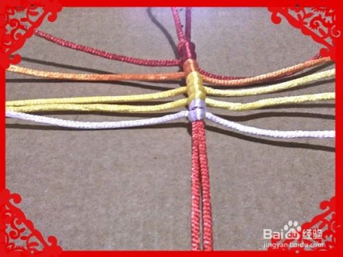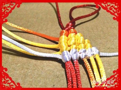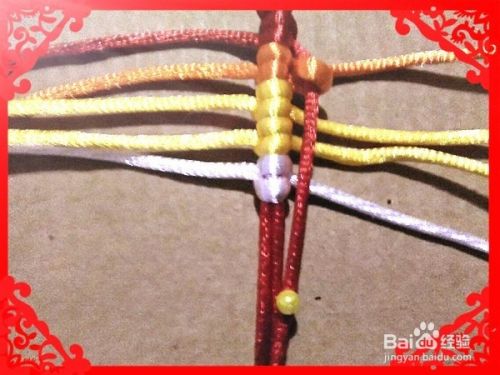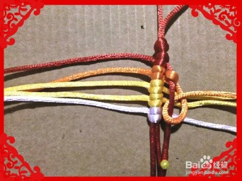 我们按照图上的顺序,把红色线1根,橙色线1根,金黄色线3根,白色线1根由上到下的顺序用斜卷结挂到做好的双联结上。