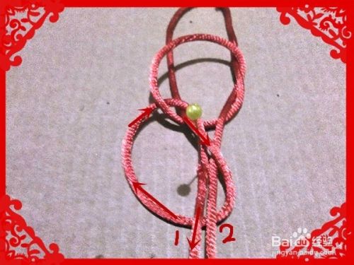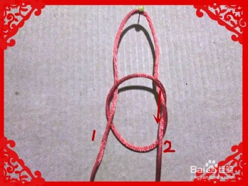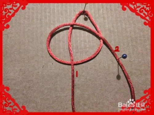 我们把一根红色的绳子先对半折好。我们把2号绳子从1号绳子的下方穿过,绕成圆环状再次从1号的上方穿过。我们用两根定位针固定好绳子防止变形。注意左边的绳子是1号,右边的绳子是2号。