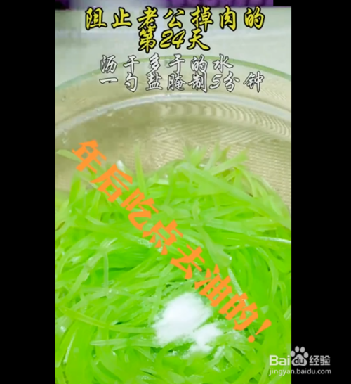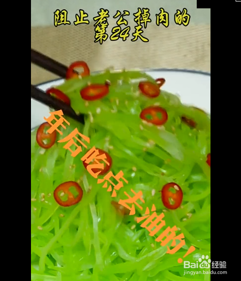 第2步,沥干水分,加入一勺盐,腌制5分钟,把水挤掉,加入一勺糖,少许香油,搅拌均匀,加入少许白芝麻和小米辣点缀即可。