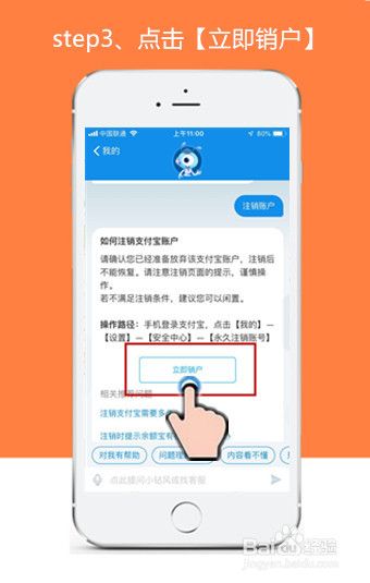 step3、在与客服的对话框内输入“注销账户”,然后客服会回复你注销账户的步骤,在下边有一个快捷按键,点击【立即销户】。(注:我的→设置→安全中心→永久注销账户)