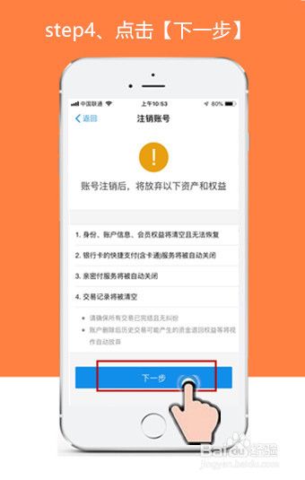 step4、系统提示是否确认注销账户,注销账户之后信息将无法恢复,绑定的快捷银行卡也会自动关闭,交易记录也将被清空,如果确认要注销账户,点击【下一步】。