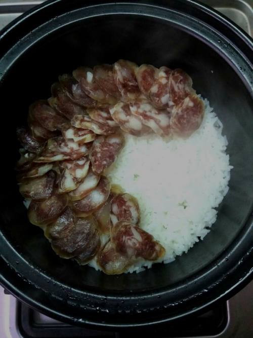 7大概十分钟不到,饭开始收水。可以看到饭表面有一个个小洞。这个时候赶快把腊肠放进去。