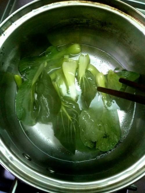 4另起一锅烧开水,加点油和盐,将青菜烫熟捞出备用。