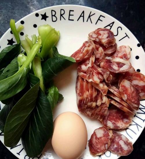 3浸泡米的过程中,把配菜处理好,白菜洗干净。腊肠切薄片。
