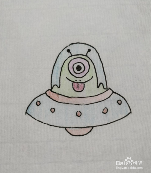 然后在船身上画出飞船的花纹。最后涂好颜色,一个外星飞船就画好啦。