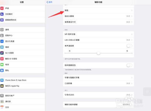 4、进入iOS系统辅助功能设置页面,点击打开键盘选项