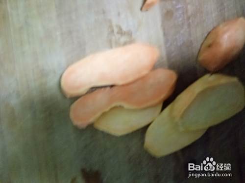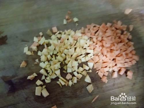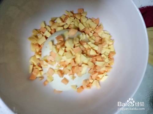 取适量的红薯,去皮后清洗干净,先切成薄片后切成小丁。尽量要剁碎一点哦。