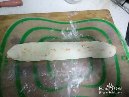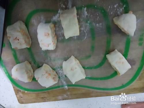 把切好的红薯丁放入面团中,把红薯丁揉进面团中,接着把面团搓成长条,然后切成大小一致的小剂子。