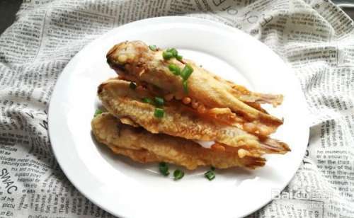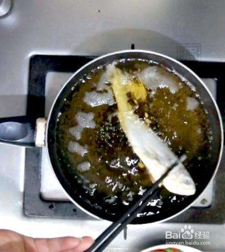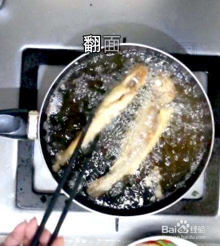 5入油锅炸制,一面约炸2分钟,中间不时用筷子拨一下鱼身,不使粘连。