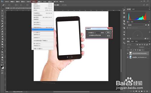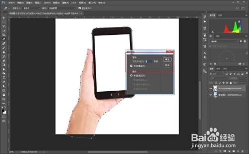 接着用你习惯的方式把手机抠出来,这里我选择的是钢笔工具,勾好边以后,鼠标右键建立选区,羽化像素0