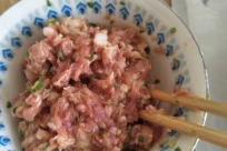切葱碎加入肉馅中,加盐、蚝油、鸡精、少许花生油调味,拌均匀。