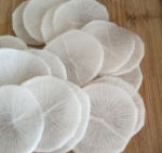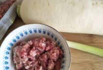 白萝卜洗净去皮切薄片,尽量切薄,不然包上肉不容易对折。