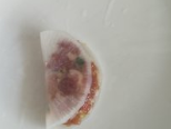 把适量肉馅放入萝卜片的一边,然后对折萝卜。