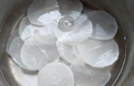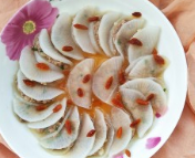 锅中加水烧开后关火,加入白萝卜片烫一到两分钟,萝卜片变软可以对折即可,过凉水备用。不可以烫太软,影响萝卜口感。