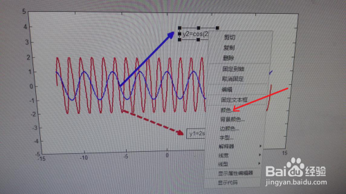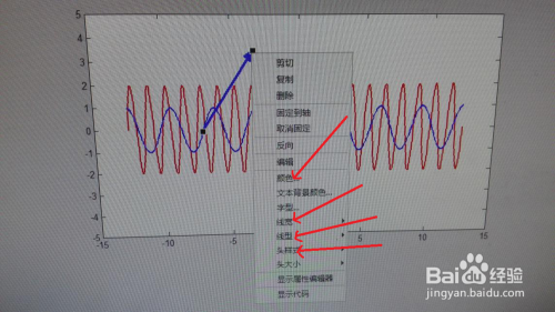 右键单击箭头可以设置箭头对应的线宽,线型,箭头头样式,大小,颜色等进行操作,在此将颜色曲线对应的箭头设置为蓝色,线宽3,实线,红色曲线对应的箭头颜色设置为红色,线宽3,虚线
