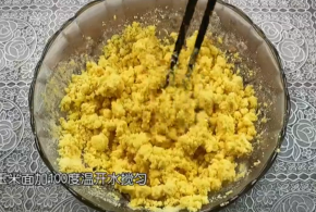 然后放凉后加入3g酵母粉、1个鸡蛋和半勺玉米面,盖上保鲜膜醒发40分钟