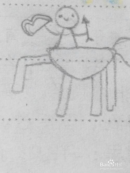 然后画出小人的眼睛和嘴巴,再画出他手中的箭和弓。
