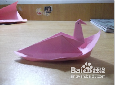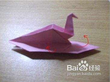 如上图所示将底部轻轻撑开并翻上去,并用笔在鸭子的头部点上眼睛。此时,可爱的鸭子游艇做好了。