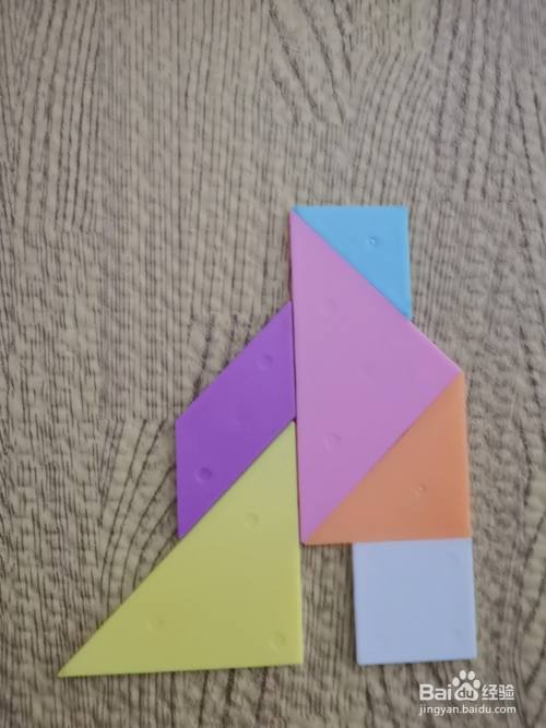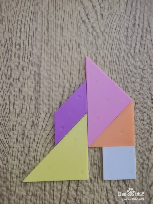 取出一个粉色大号三角形板放在橘色中号板的上方,如图所示。