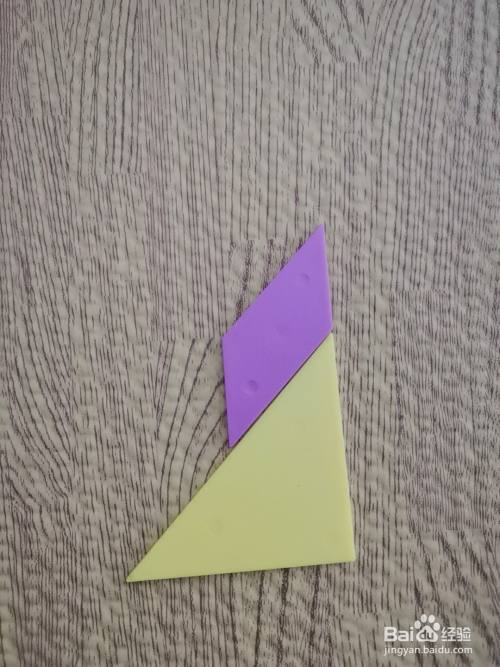 取出蓝色小号三角形板放在粉色大号板的上方,如图所示。