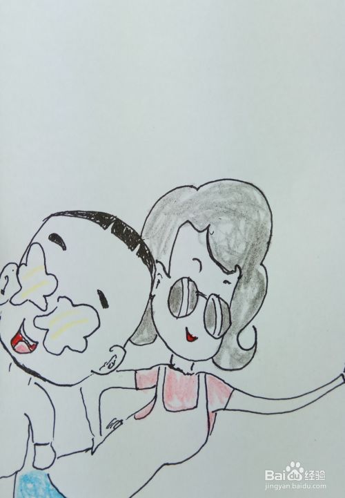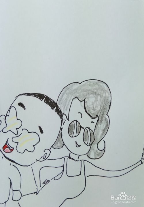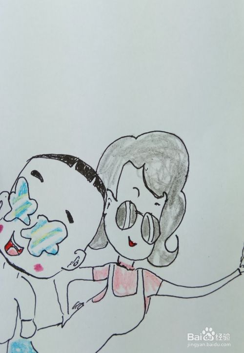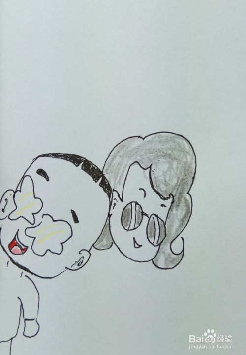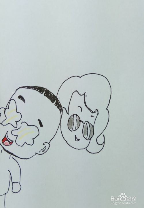 再用水彩笔涂出大头儿子所戴眼镜的色彩,最后用粗线条画出地面背景,修饰一下细节,简笔画就画好了。