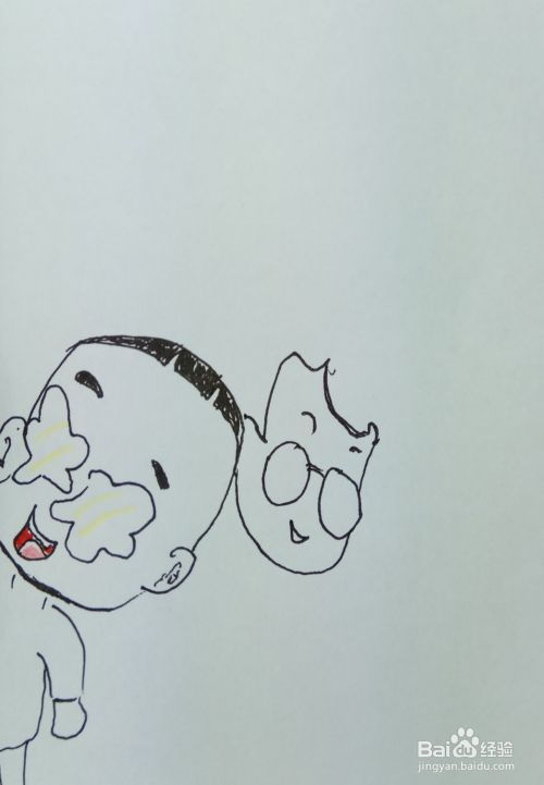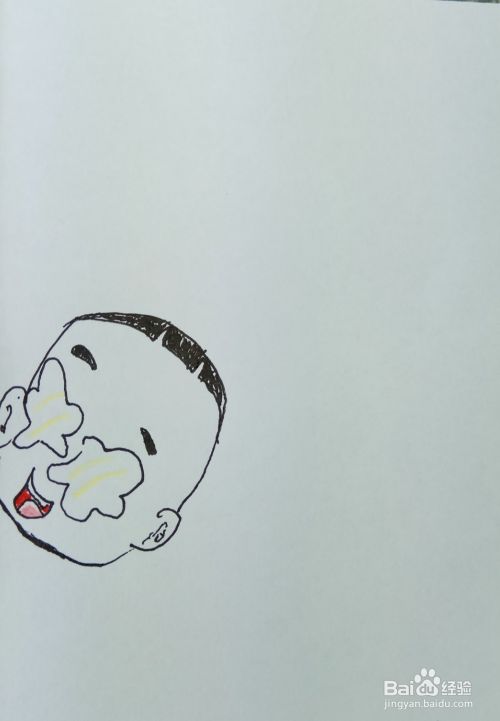 在白纸上用线条和曲线画出大头儿子的头部轮廓,并画出他的五官和头发,然后再画出它眼睛上戴着的卡通眼镜。