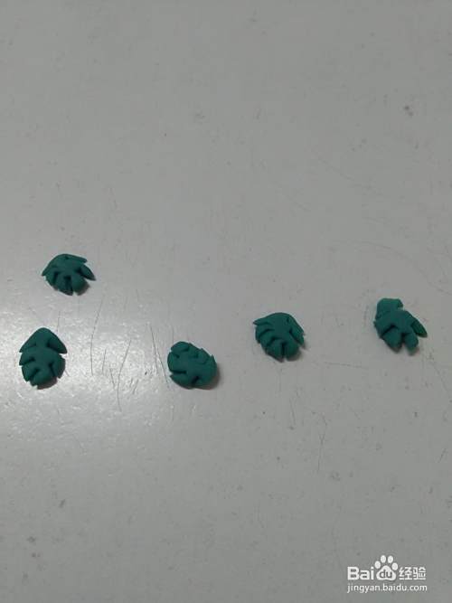 用蓝色彩泥捏五个小小的椭圆形。