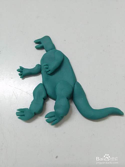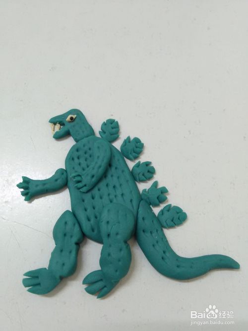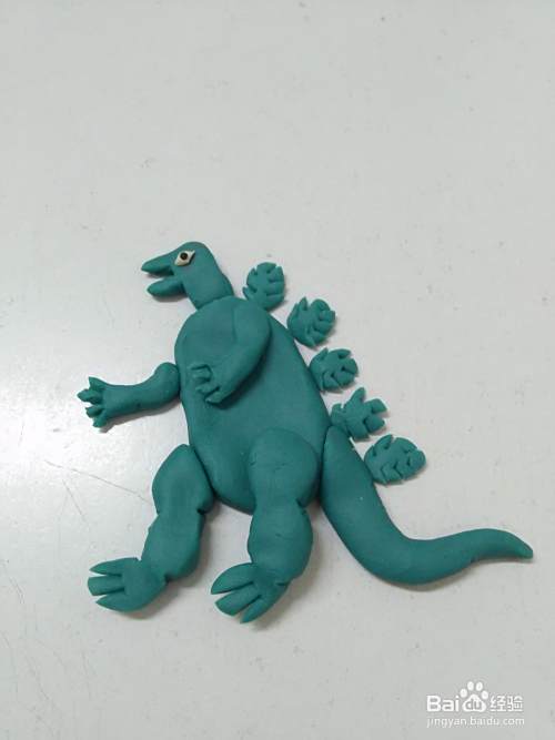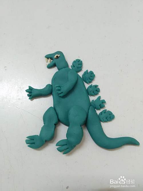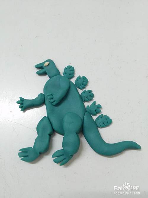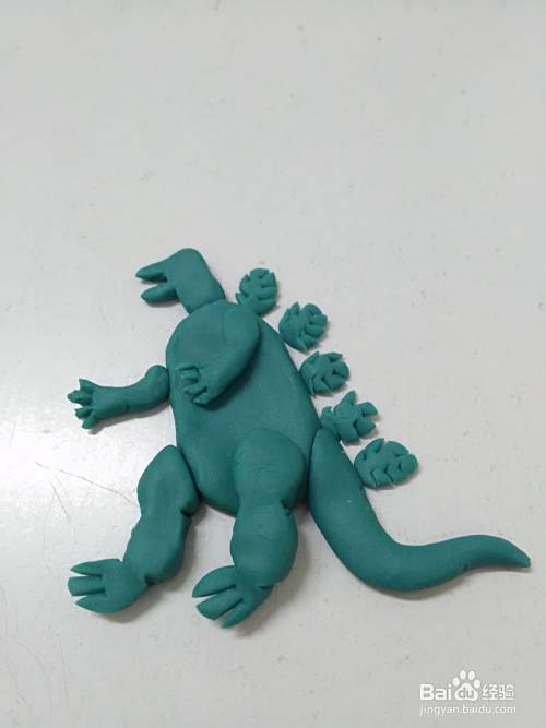 用彩泥做这个人物,先分别做出头部、身体、四肢、尾巴和背上的刺,再拼在一起,这样做比较简单。