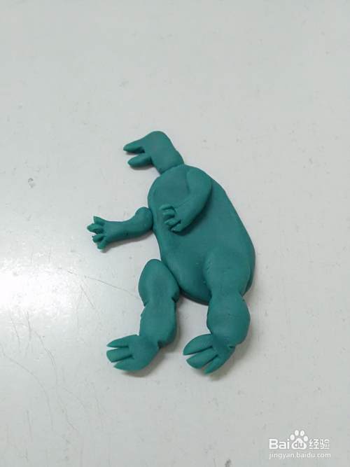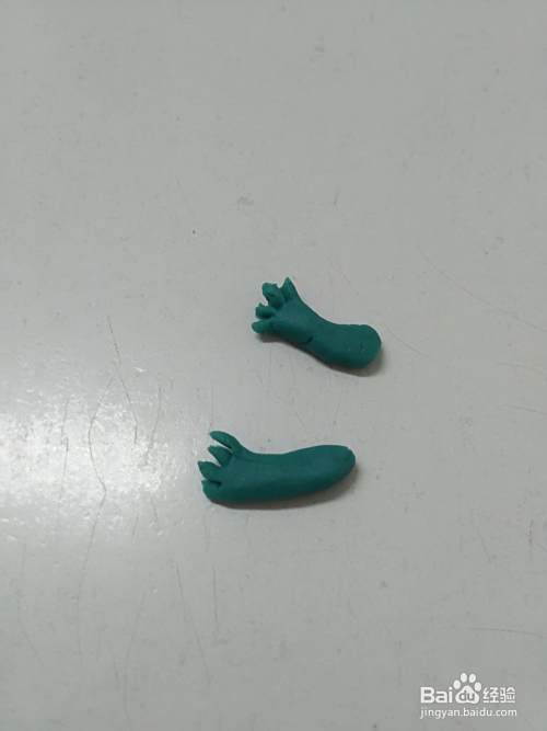 再用彩泥搓两个粗粗的小条,用手捏成葫芦的形状,末端捏成圆形,用小刀切两个小口,当作它的后腿和脚趾,然后粘在身体的下方。