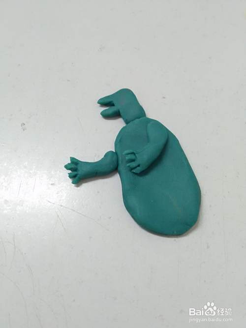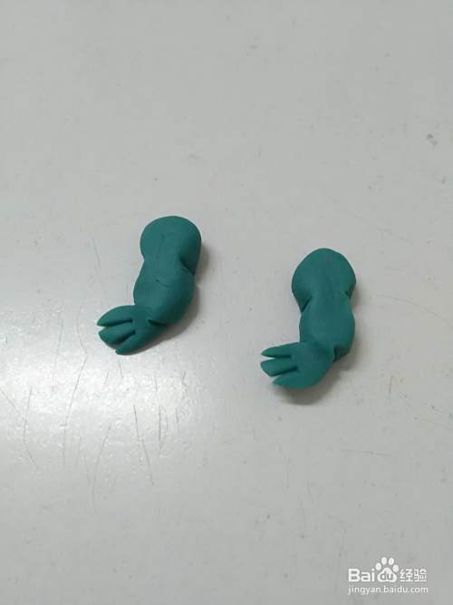 用彩泥捏两个小条,当作它的前腿,末端用小刀切三下,分出四个手指,把前腿粘在身体的左右两侧。